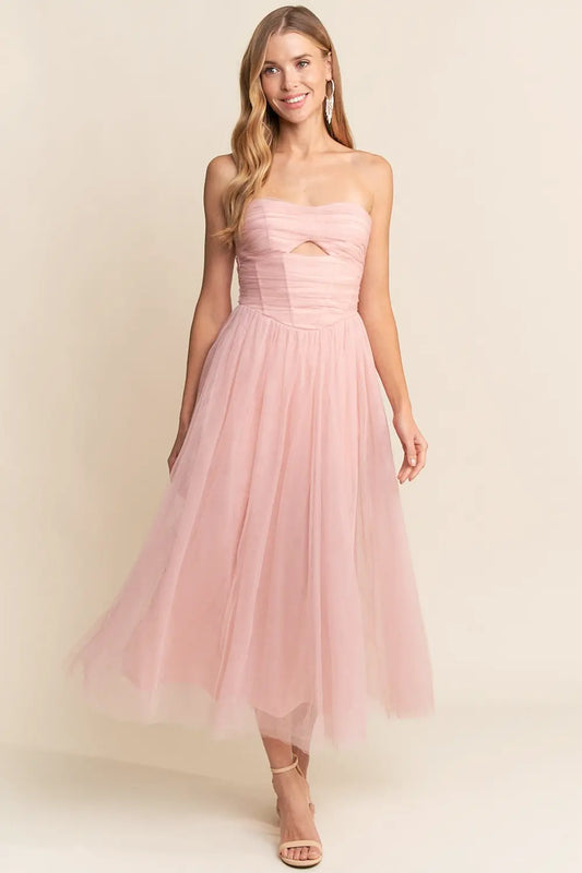 Vestido Midi de Tul Rosa Palo Strapless con Cut Out