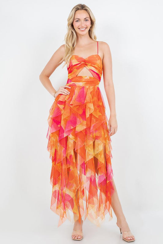Vestido Maxi Floral con Volantes y Espalda Lace Up fucsia