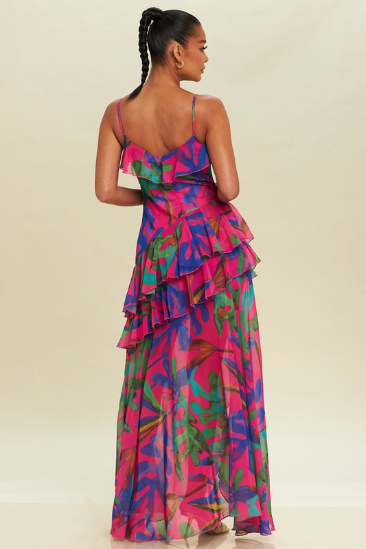VESTIDO DE GASA CON OLANES ROSA CON HOJAS PALMA