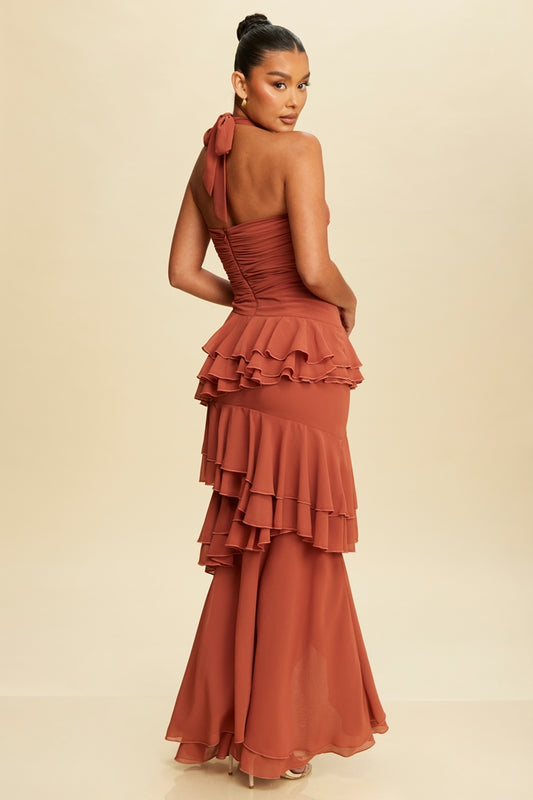 Vestido Maxi Floral con Volantes y Espalda Lace Up Verde
