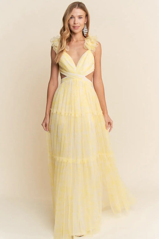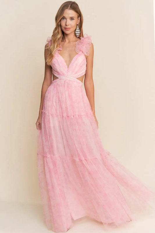 Vestido Maxi Floral con Volantes y Espalda Lace Up fucsia