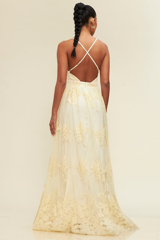 Vestido de Tul Con Flores escote V y aberturas amarillo