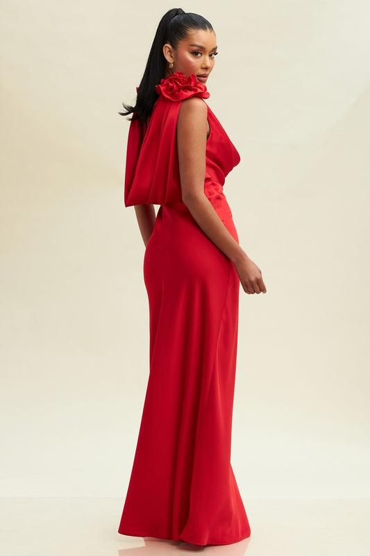 Vestido Satin Pegado rojo con flor 3d en hombro