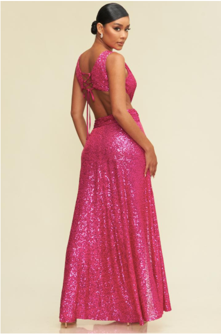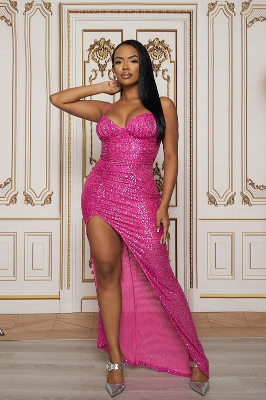 VESTIDO LARGO LENTEJUELA PLISADO CON MAXI ABERTURA ROSA