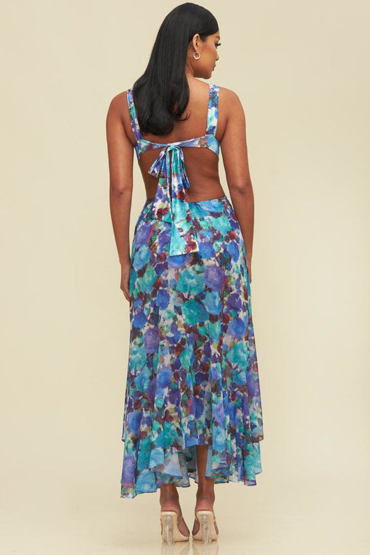 VESTIDO DE TUL CON FLORES ESCOTE EN V Y ABERTURAS VINO