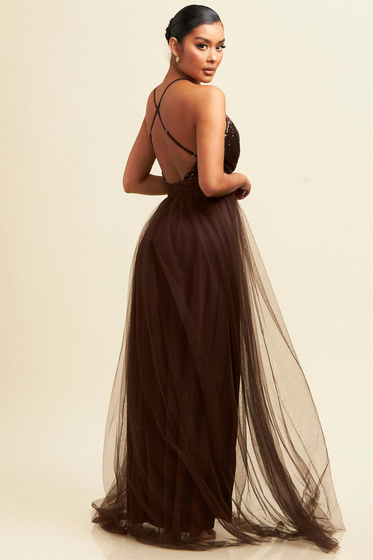 Vestido Escote En V Con Lentejuela Y Tull Chocolate