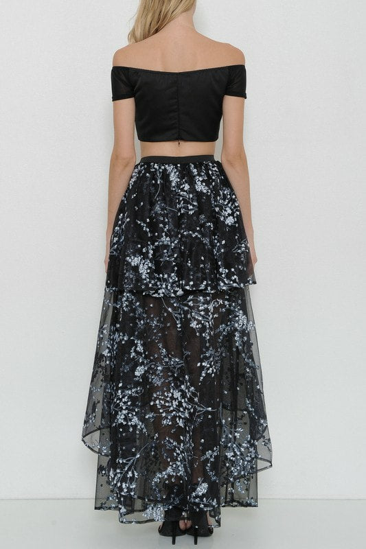 VESTIDO LARGO NEGRO CON COLA DE SIRENA CON OLANES