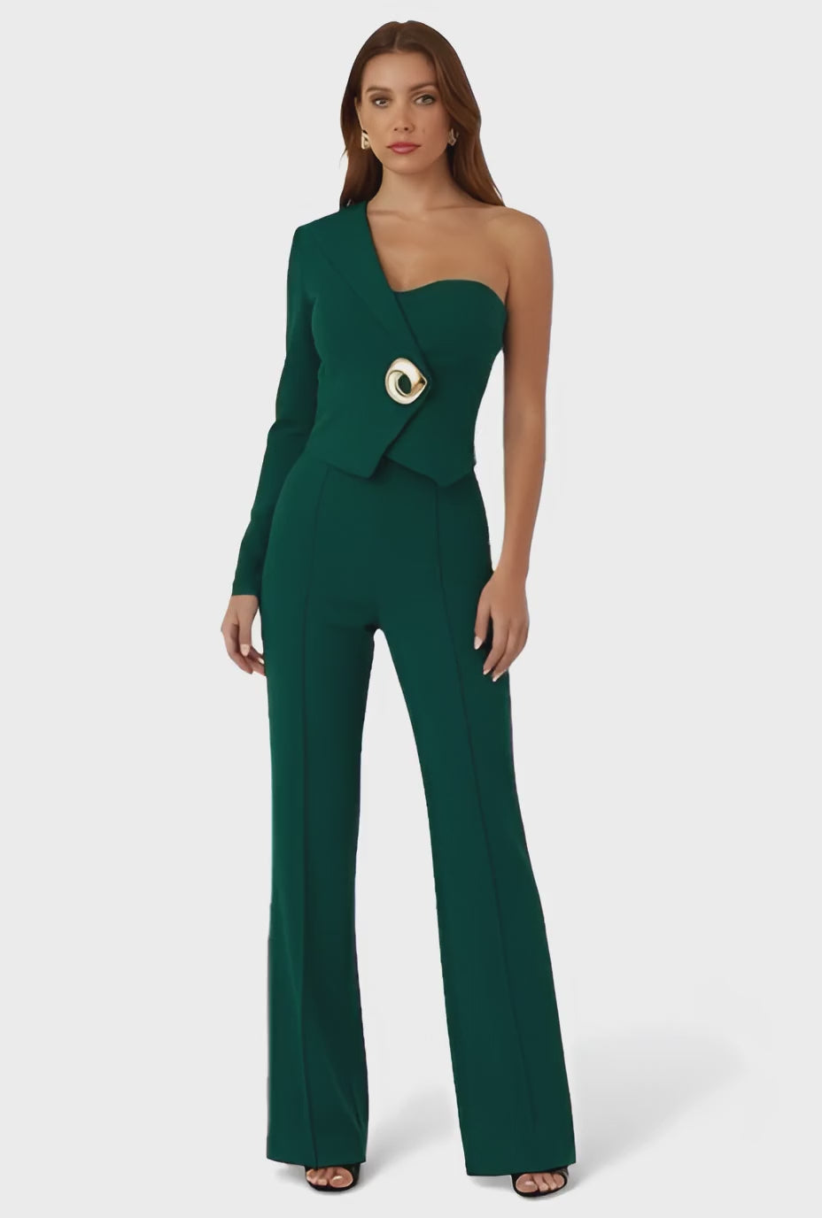 Eleva tu presencia con el Jumpsuit Esmeralda Asimétrico Elegance, una pieza sofisticada que redefine el poder femenino. Su diseño de un solo hombro crea un efecto moderno y elegante, mientras que el corte estructurado estiliza la figura de forma impecable.