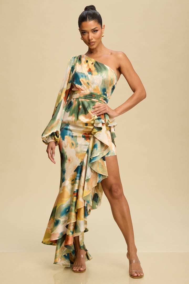 Confeccionado en una tela satinada de caída ligera, presenta un escote de un solo hombro con manga larga abullonada y un corte entallado en cintura que estiliza la figura.