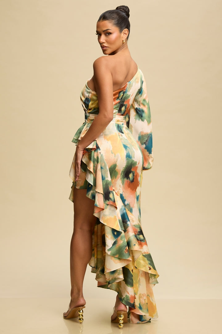 El vestido estampado asimétrico con volantes combina estilo y elegancia en un diseño moderno que resalta la silueta femenina.