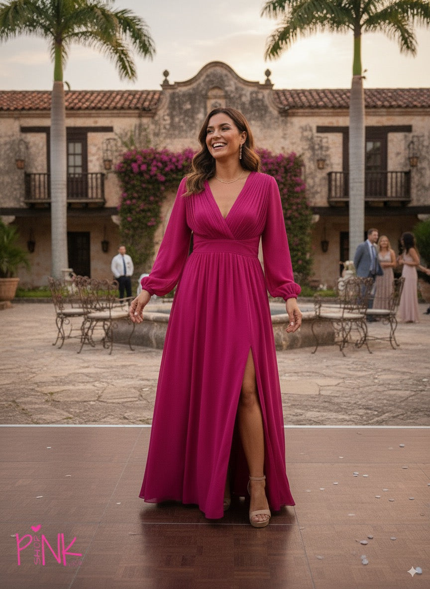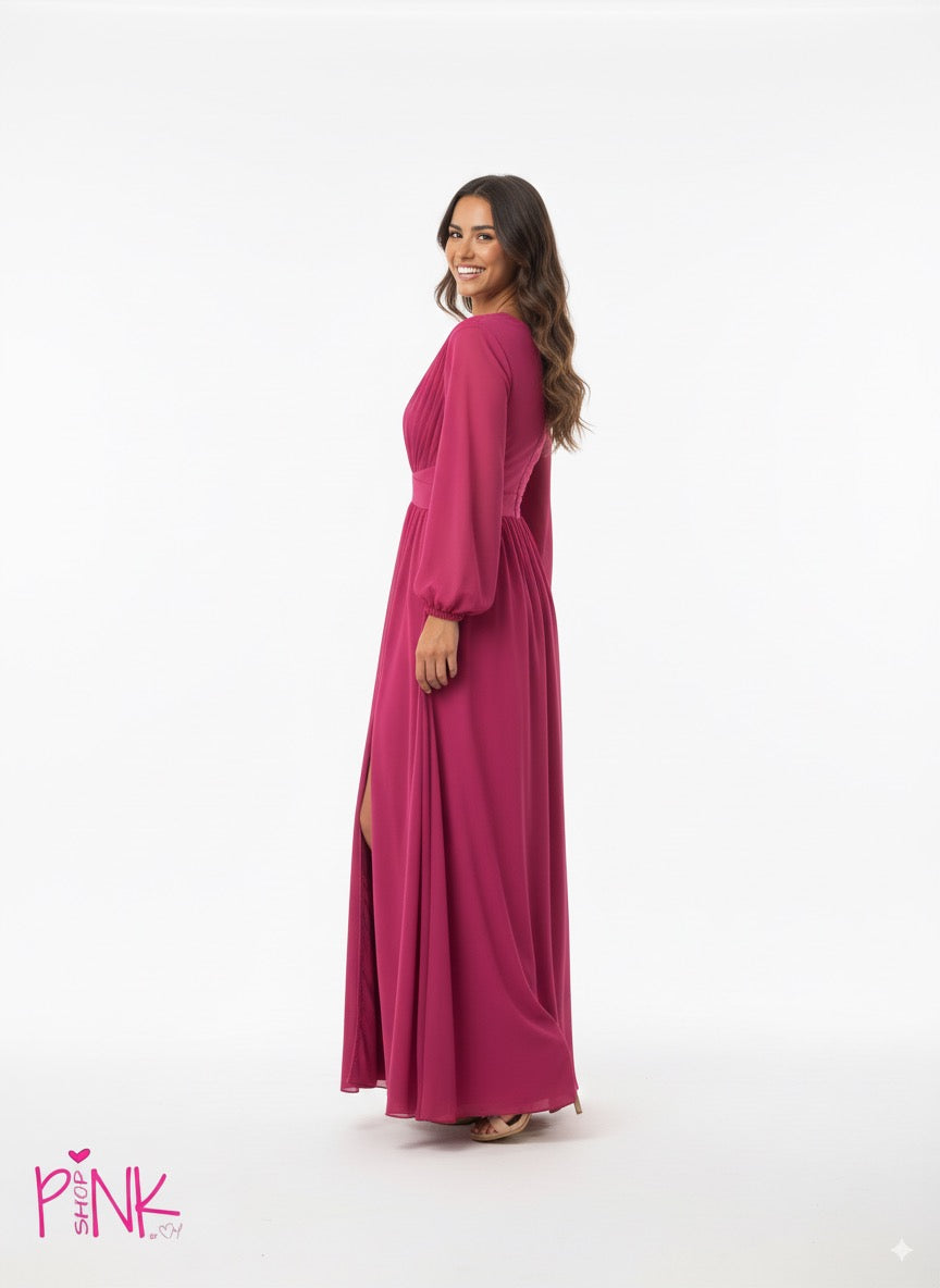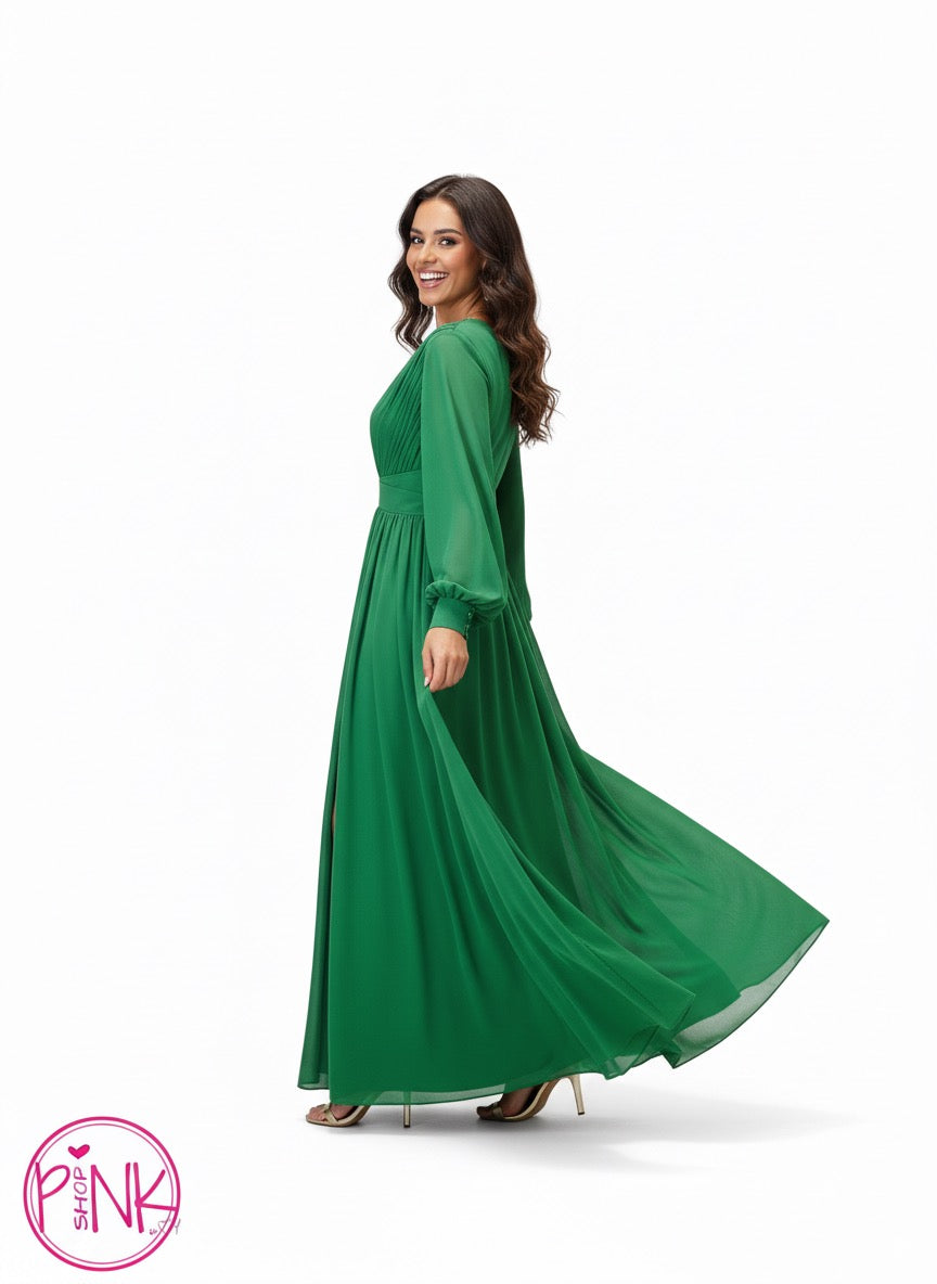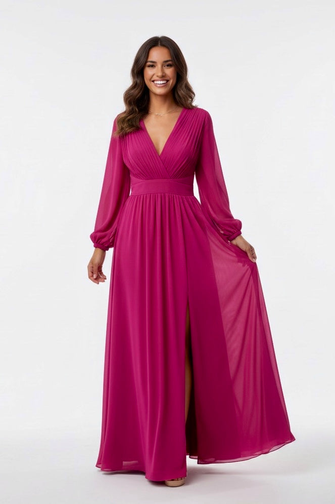 Vestido de Fiesta Largo con Escote en V Manga Larga y Abertura