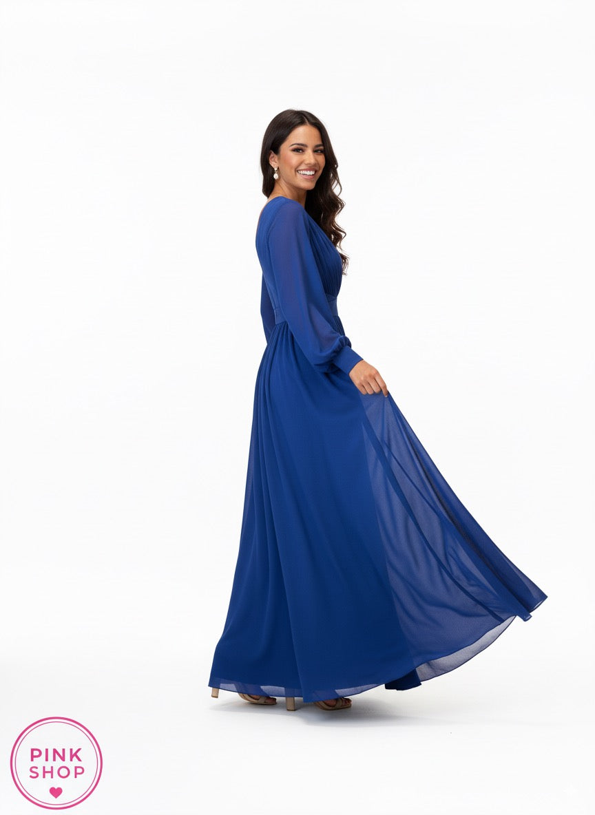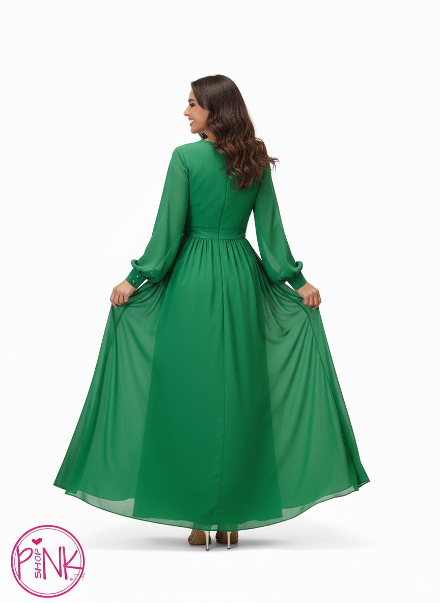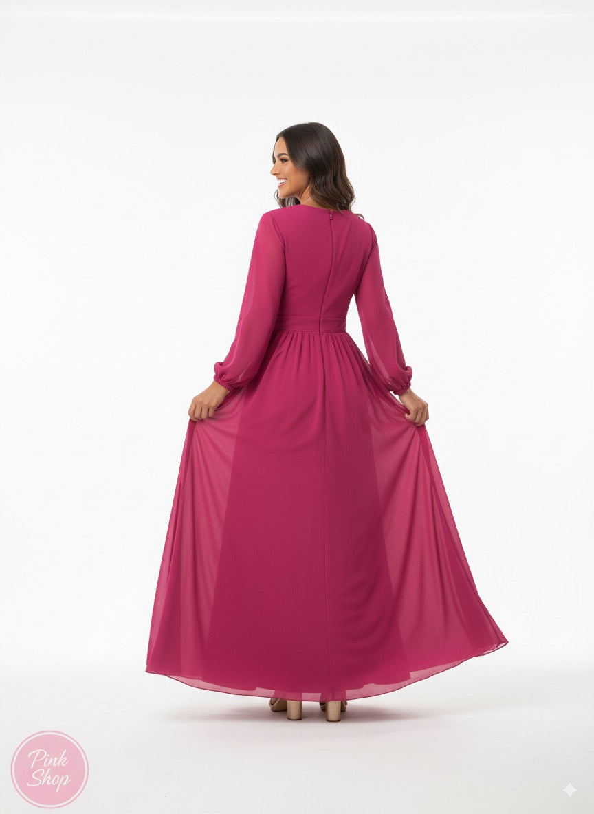 Vestido de Fiesta Largo con Escote en V Manga Larga y Abertura