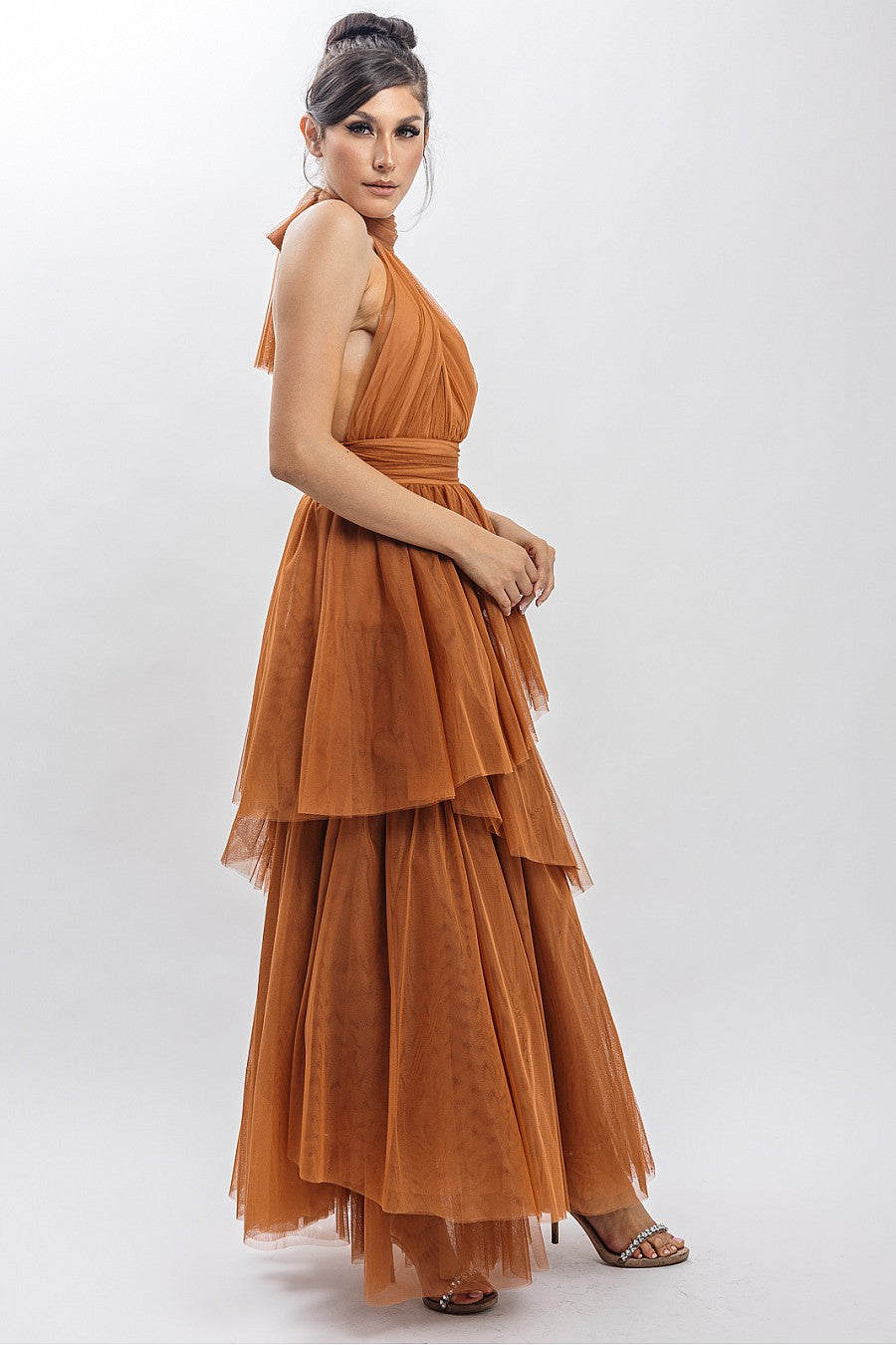 Vestido Largo Tul halter Falda Capas camel