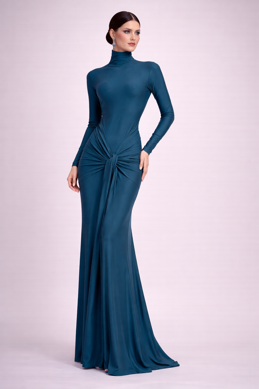 Su diseño de cuello alto y manga larga equilibra sofisticación y sensualidad, mientras que el drapeado frontal con nudo crea un efecto visual que estiliza la cintura y alarga la silueta.