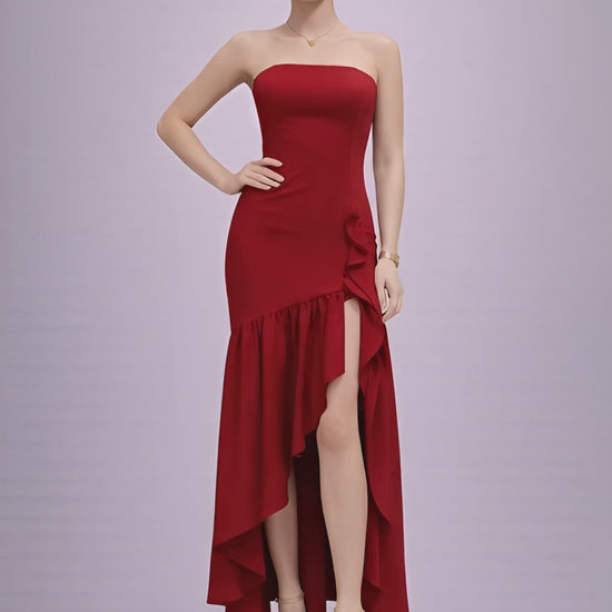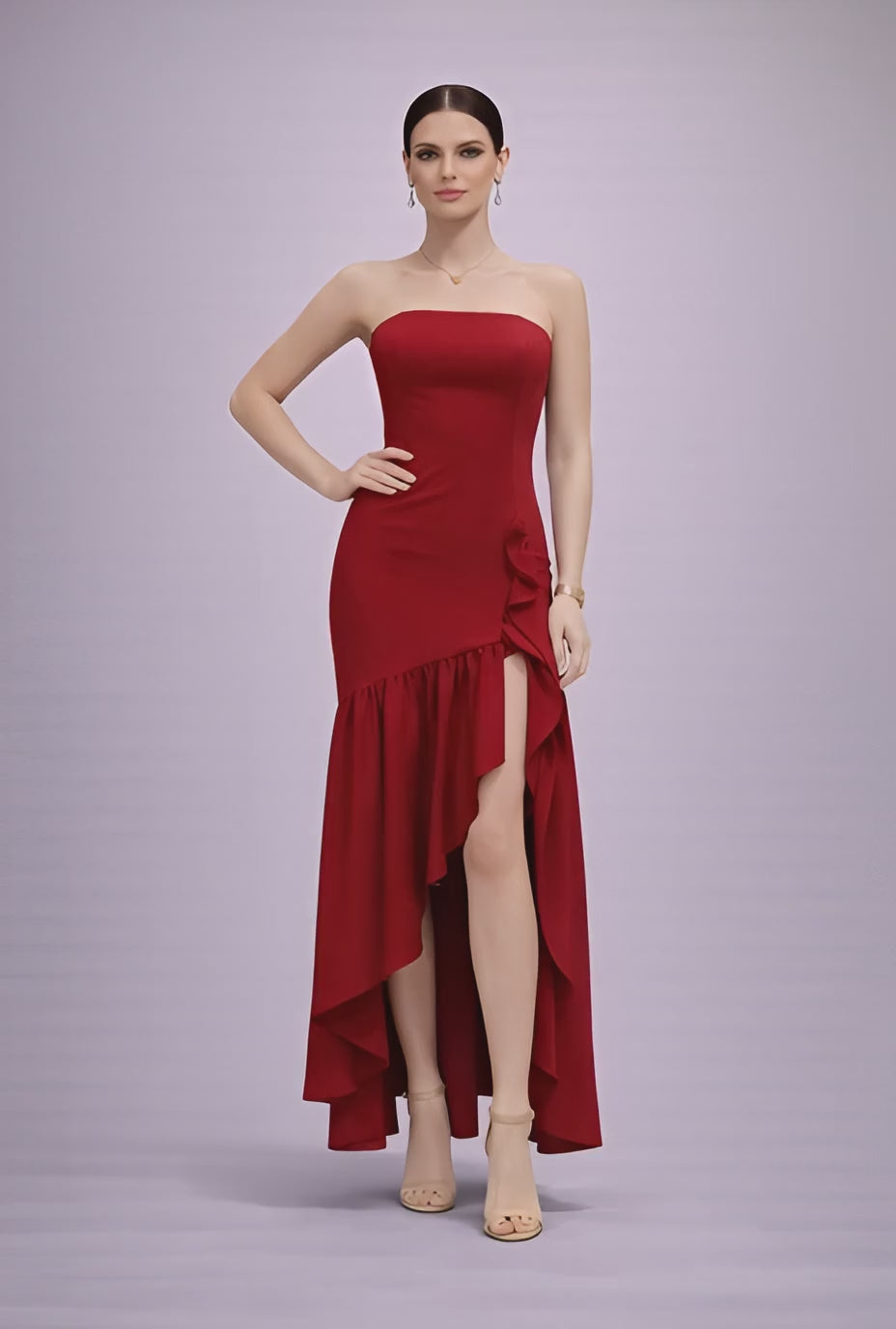 Confeccionado en tono rosa pastel, su corte strapless y su falda asimétrica con detalle de volante crean un movimiento delicado y favorecedor. Ideal para bodas, cocteles o cenas especiales donde quieras lucir sofisticada y fresca.
